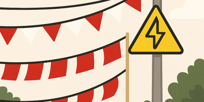 KARIMATA.NET, PAMEKASAN – Antusiasme masyarakat dalam menyambut Hari Kemerdekaan terlihat dari banyaknya pernak-pernik bertema 17 Agustus seperti lampu hias dan umbul-umbul yang mulai terpasang di berbagai tempat. Namun, pemasangan umbul-umbul tanpa memperhatikan aspek keamanan berpotensi membahayakan, terutama jika menyentuh jaringan listrik.