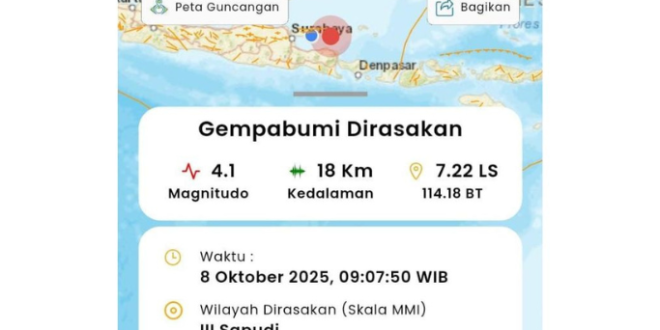 KARIMATA.NET, SUMENEP – Kabupaten Sumenep, kembali diguncang gempa bumi berkekuatan Magnitudo 4,1 pada Rabu (8/10/2025) pukul 09.07 WIB. Pusat gempa berada di kedalaman 11 kilometer, 44 kilometer tenggara Sumenep, tepatnya di koordinat 7.22 Lintang Selatan dan 114.17 Bujur Timur.