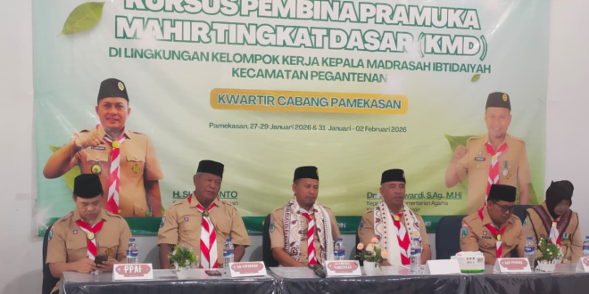 KARIMATA MEDIA, PAMEKASAN – Kursus Mahir Dasar (KMD) bagi Pembina Pramuka yang diselenggarakan Kelompok Kerja Kepala Madrasah Ibtidaiyah (KKMI) Kecamatan Pegantenan berlangsung lancar di Aula MI Bustanul Mubtadiin, Desa Plakpak, Kecamatan Pegantenan. Kegiatan ini diikuti puluhan pembina dari berbagai madrasah ibtidaiyah dan dihadiri sejumlah tokoh penggerak Pramuka serta pejabat Kementerian Agama Kabupaten Pamekasan.