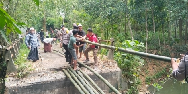 KARIMATAMEDIA, PAMEKASAN – Jembatan penghubung antara Desa Pangorayan, Proppo menuju Desa Rek Kerrek, Kecamatan Palengaan, Kabupaten Pamekasan, sempat ambruk pada Rabu (11/2/2026). Akibat kejadian tersebut, akses utama warga sempat tertutup sebelum akhirnya dilakukan perbaikan sementara secara gotong royong oleh warga bersama unsur Forkopimda setempat.
