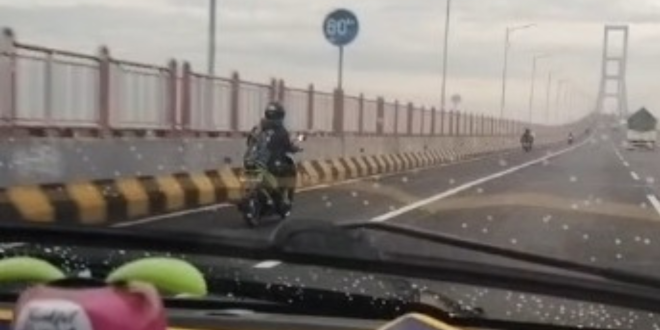 KARIMATAMEDIA, SURABAYA – Kendaraan roda dua masih kerap melintas di jalur roda empat di Jembatan Suramadu, meski rambu larangan telah terpasang jelas.