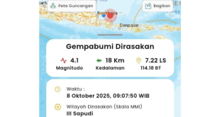 KARIMATA.NET, SUMENEP – Kabupaten Sumenep, kembali diguncang gempa bumi berkekuatan Magnitudo 4,1 pada Rabu (8/10/2025) pukul 09.07 WIB. Pusat gempa berada di kedalaman 11 kilometer, 44 kilometer tenggara Sumenep, tepatnya di koordinat 7.22 Lintang Selatan dan 114.17 Bujur Timur. Kepala BMKG Trunojoyo Sumenep, Ari Widjajanto saat dikonfirmasi menyampaikan, gempa yang terjadi kali ini merupakan bagian dari rangkaian gempa susulan sejak …